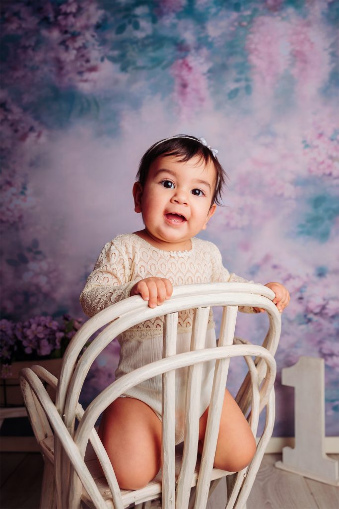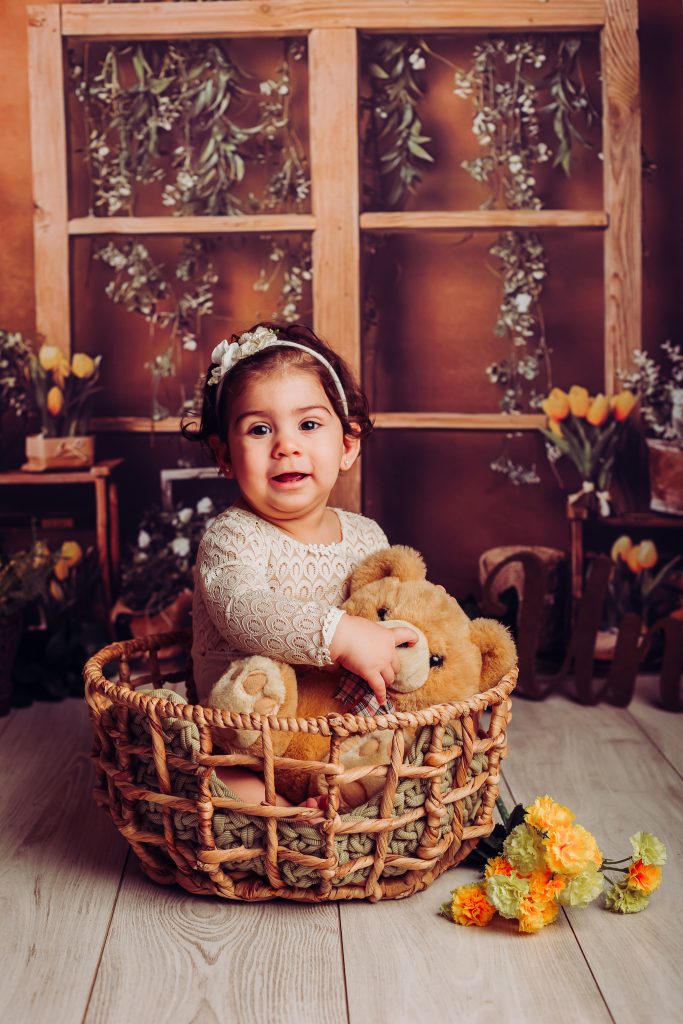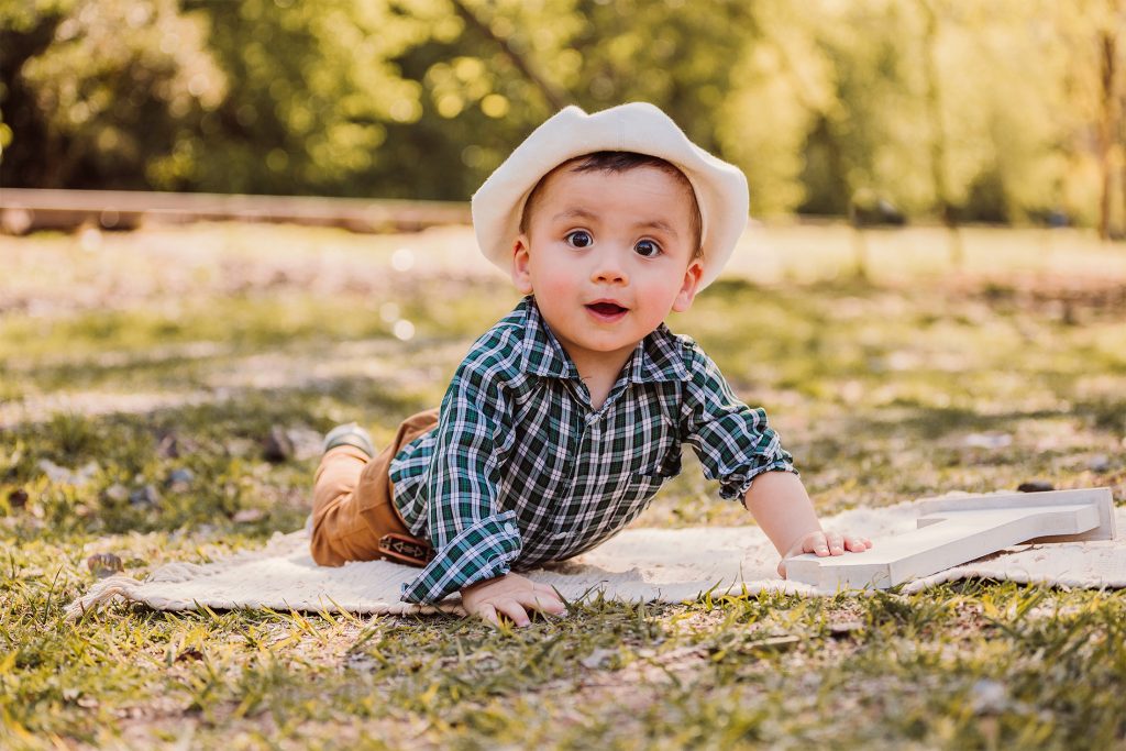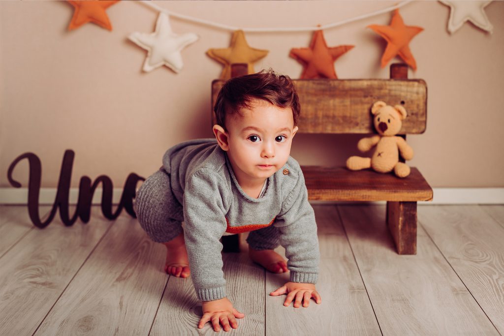 Hay familias que eligen hacer la sesión newborn y después la del primer año, pero hay dos momentos muy lindos para retratar: uno es alrededor de los 3 meses, cuando empiezan las sonrisas sociales, lxs bebés nos siguen con la mirada y hay interacción con la cámara. El otro momento es cuando empiezan a sentarse solitxs alrededor de los 7 meses. En ese momento ya podemos usar algunos props como cajones y contenedores, y hasta algún banquito 🙂