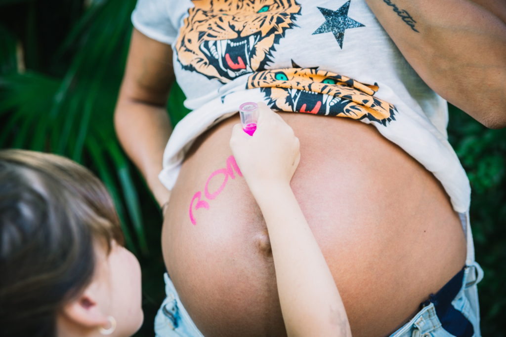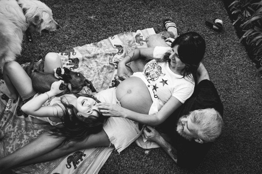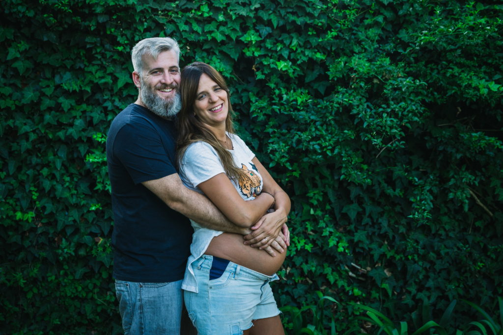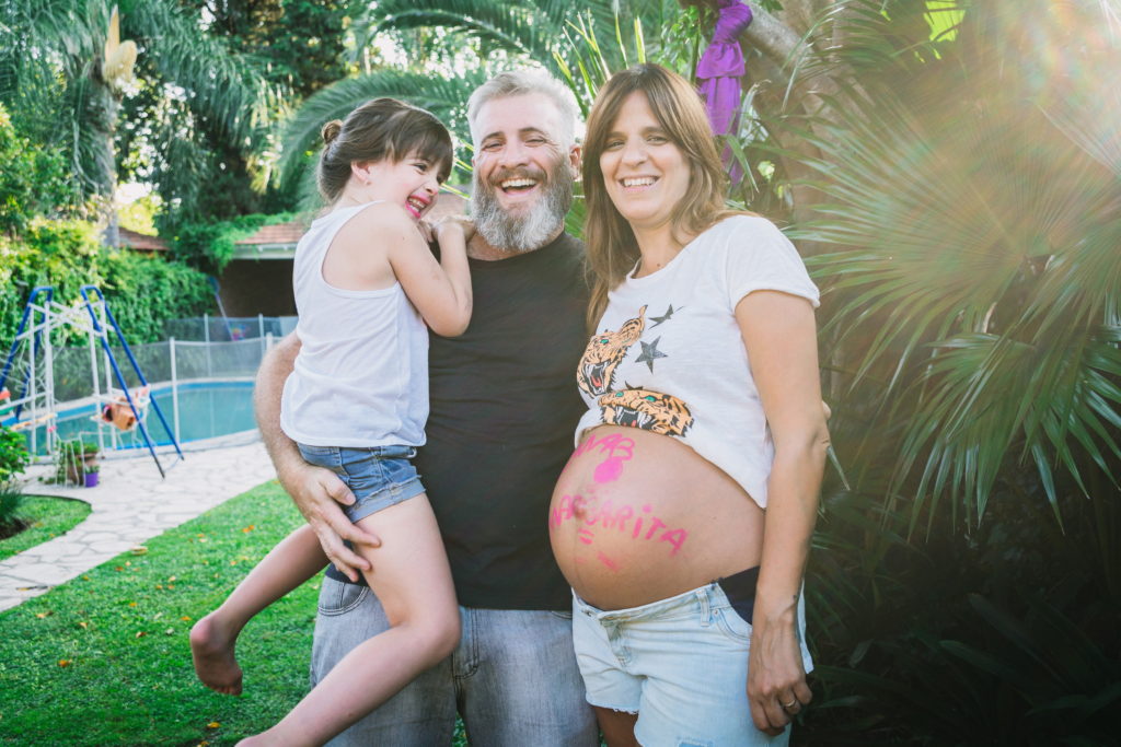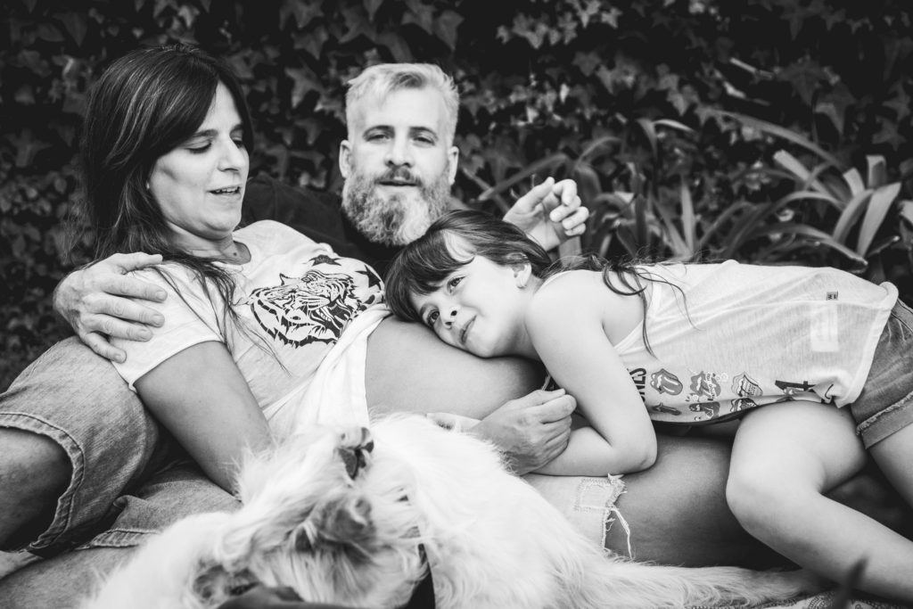 La primer sesión fué un documental familiar en casa de Hurlingham. Se les ocurrió empezar mirando fotos, linda situación para registrar! Se nota en las expresiones de Pepa que lxs niñxs disfrutan ver fotos de cuando eran más chiquitxs y escuchar historias de cuando lxs esperaban a ellxs! Por eso es importante imprimirlas!. Hicimos algunas fotos dentro de la casa y después en el patio donde participaron los perros, y terminamos con una obra de arte en panza!