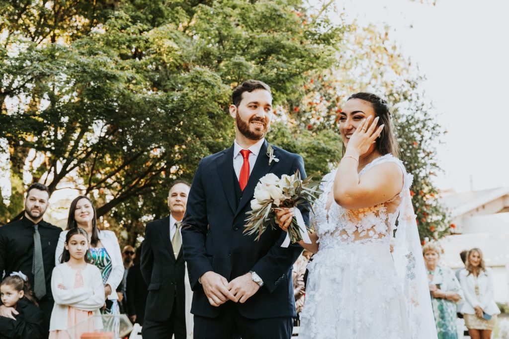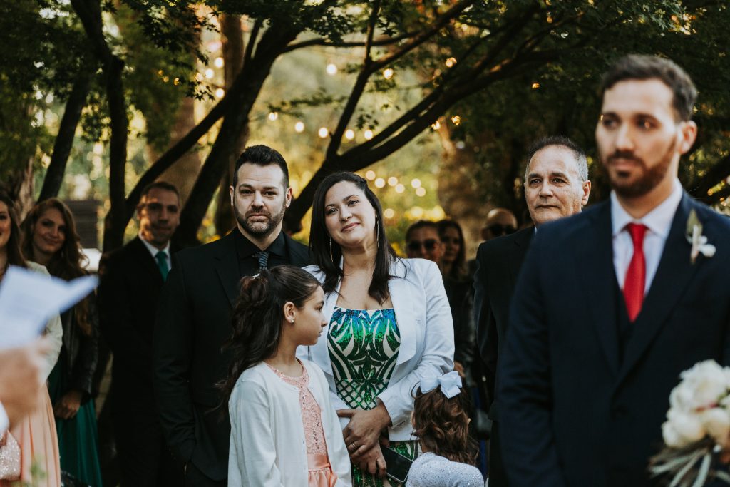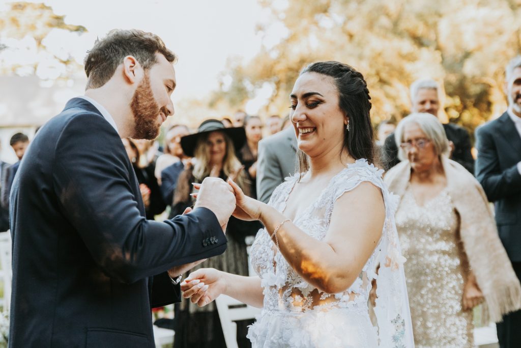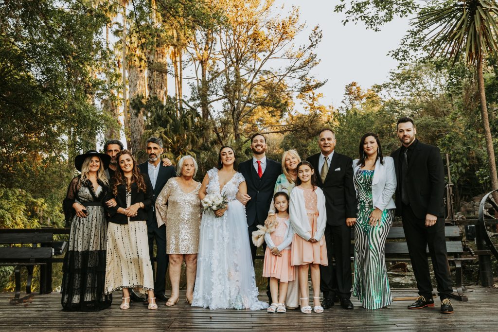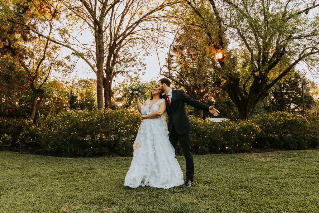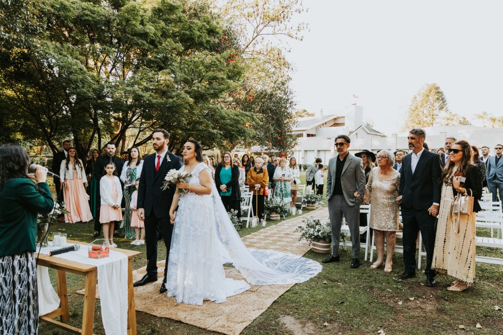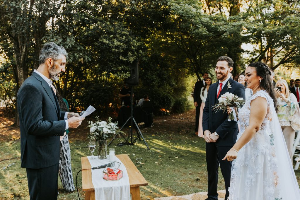 La ceremonia comenzó al atardecer, en el hermoso parque del salón. Fue oficiada por una amiga cercana de la pareja, lo que hizo que cada palabra resonara con autenticidad y cariño. Lxs hermanos de Iara y Fernando compartieron discursos emotivos que provocaron lágrimas y sonrisas en la pareja y sus invitadxs.