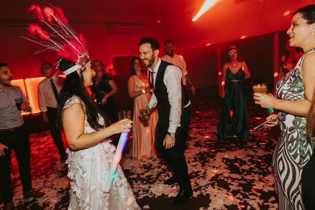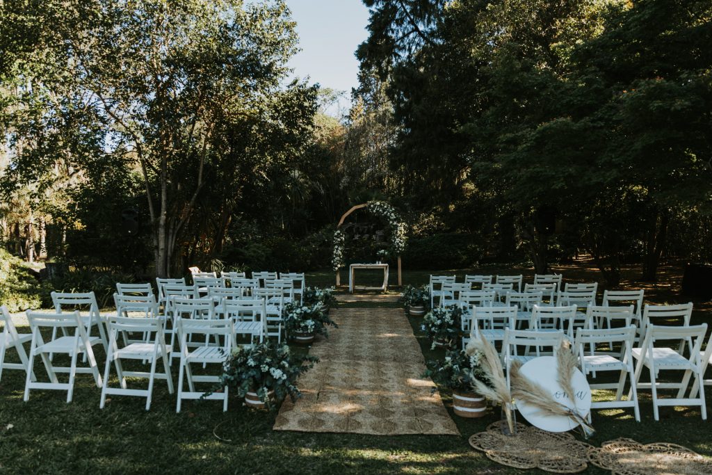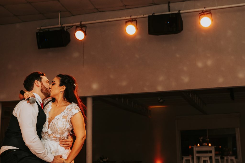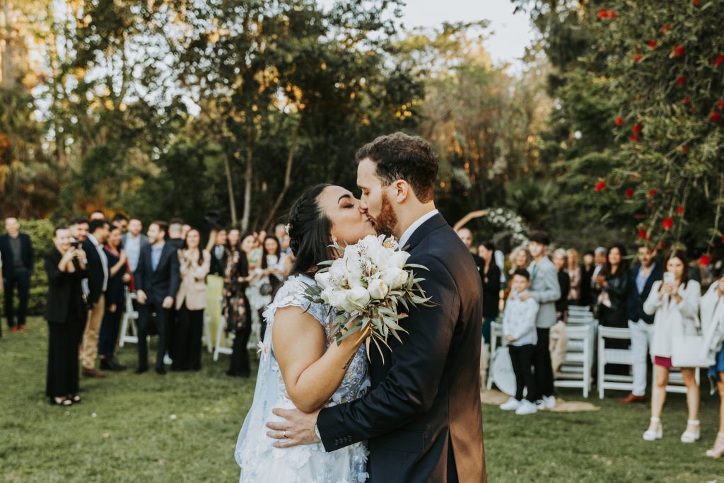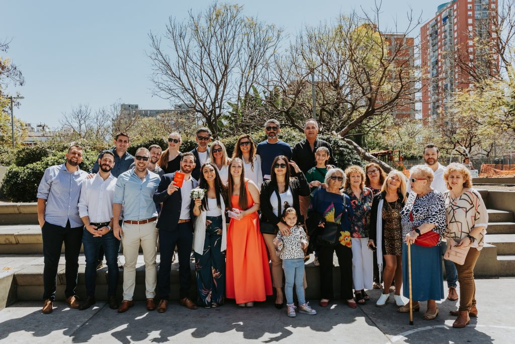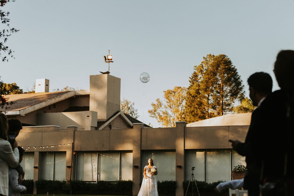 La ceremonia comenzó al atardecer, en el hermoso parque del salón. Fue oficiada por una amiga cercana de la pareja, lo que hizo que cada palabra resonara con autenticidad y cariño. Lxs hermanos de Iara y Fernando compartieron discursos emotivos que provocaron lágrimas y sonrisas en la pareja y sus invitadxs.