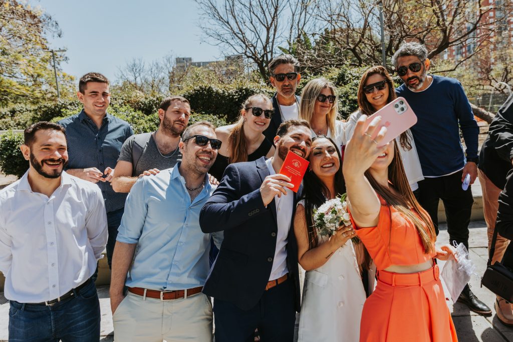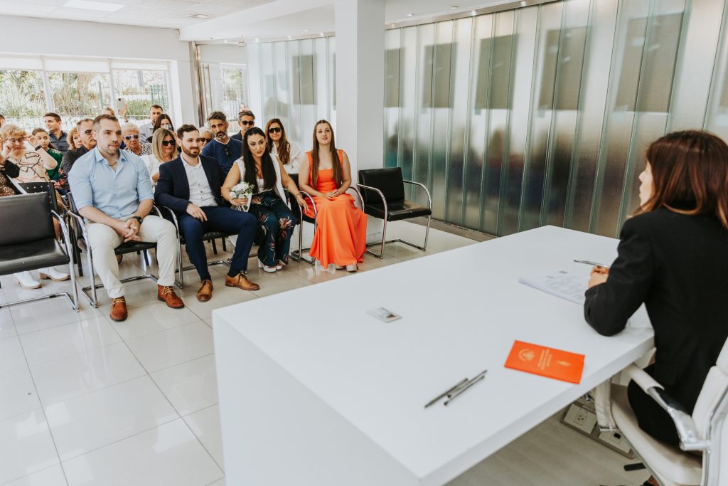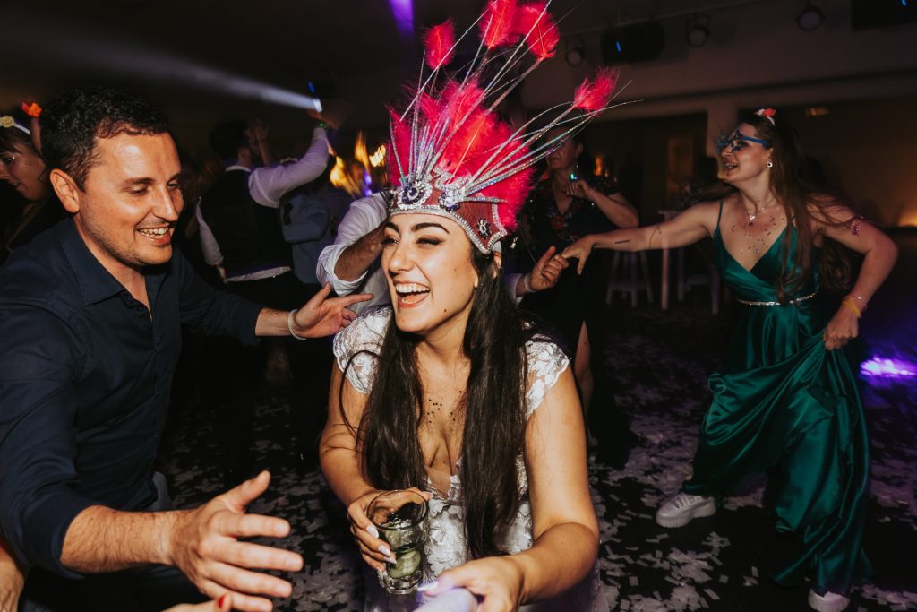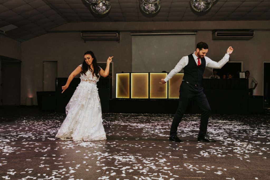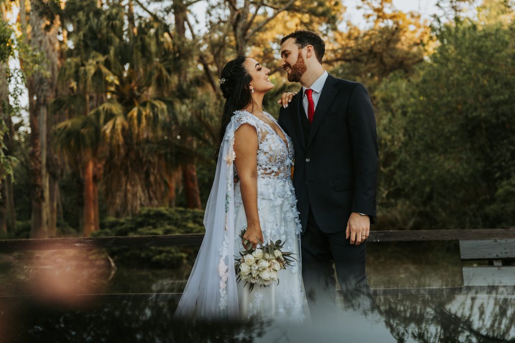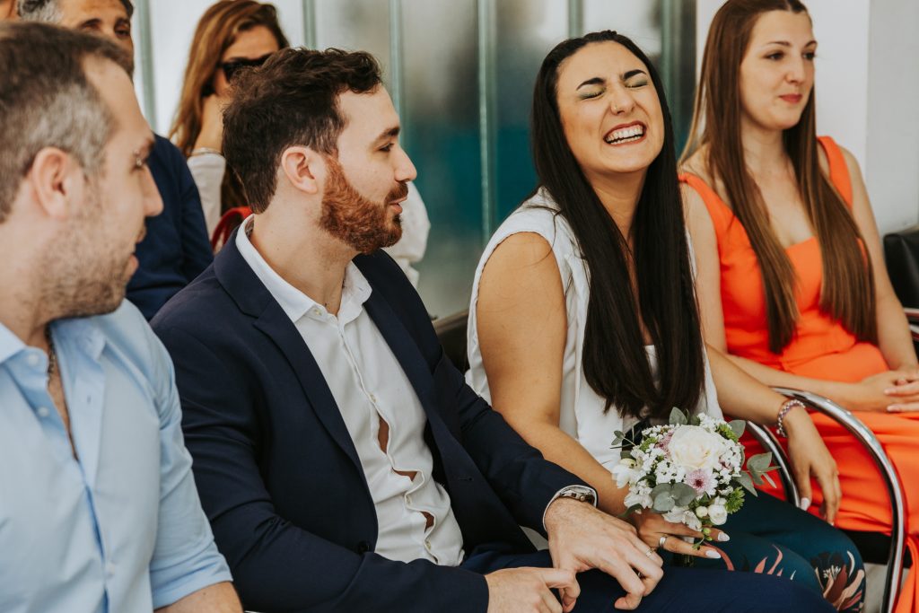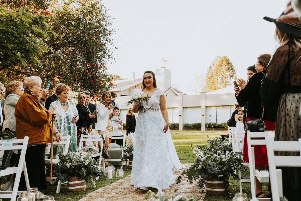 La ceremonia comenzó al atardecer, en el hermoso parque del salón. Fue oficiada por una amiga cercana de la pareja, lo que hizo que cada palabra resonara con autenticidad y cariño. Lxs hermanos de Iara y Fernando compartieron discursos emotivos que provocaron lágrimas y sonrisas en la pareja y sus invitadxs.
