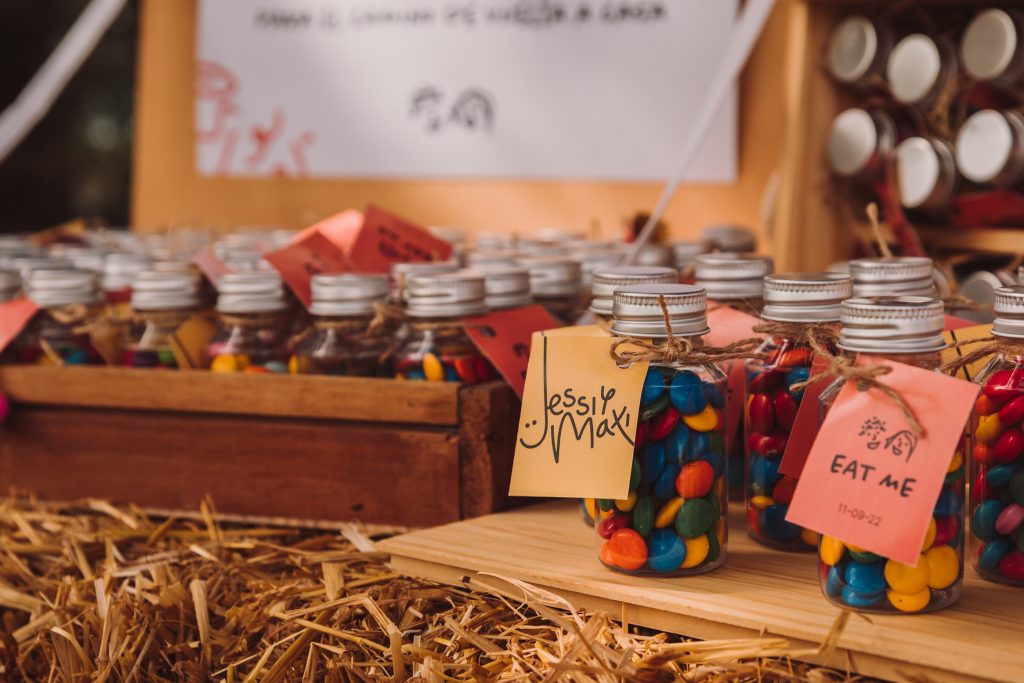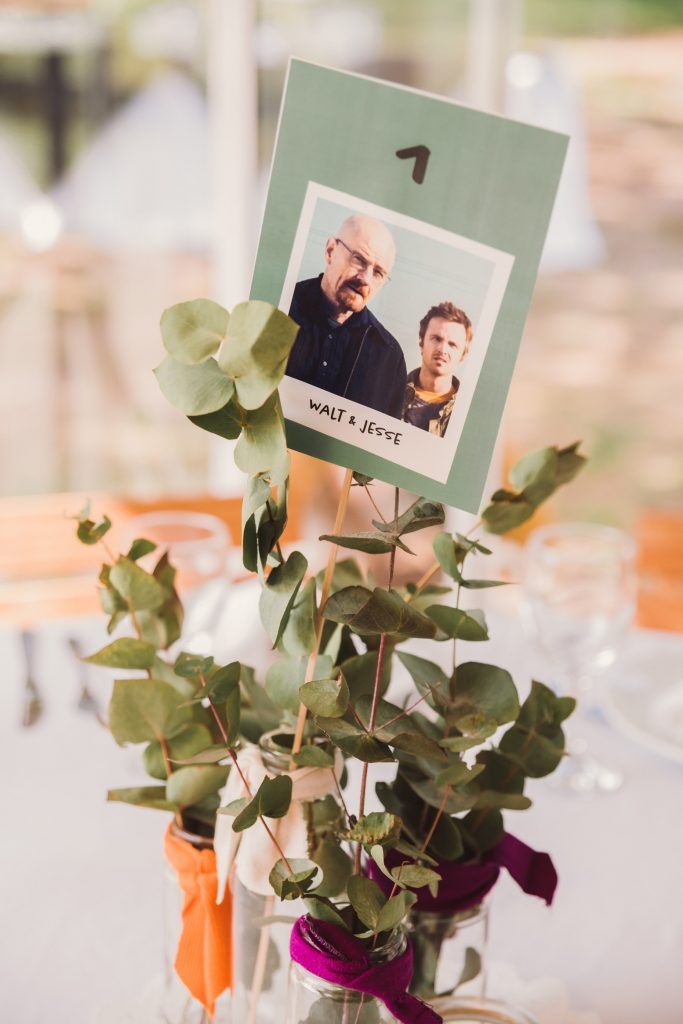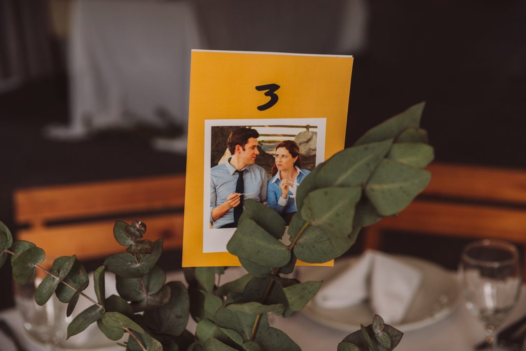 Una de las características más lindas de esta boda fue la forma en que Jessi y Maxi incorporaron el diseño gráfico en cada detalle, y su pasión por las series y películas en los nombres de las mesas, haciendo un tributo a las parejas icónicas como Mónica y Chandler o Jim y Pam 🙂